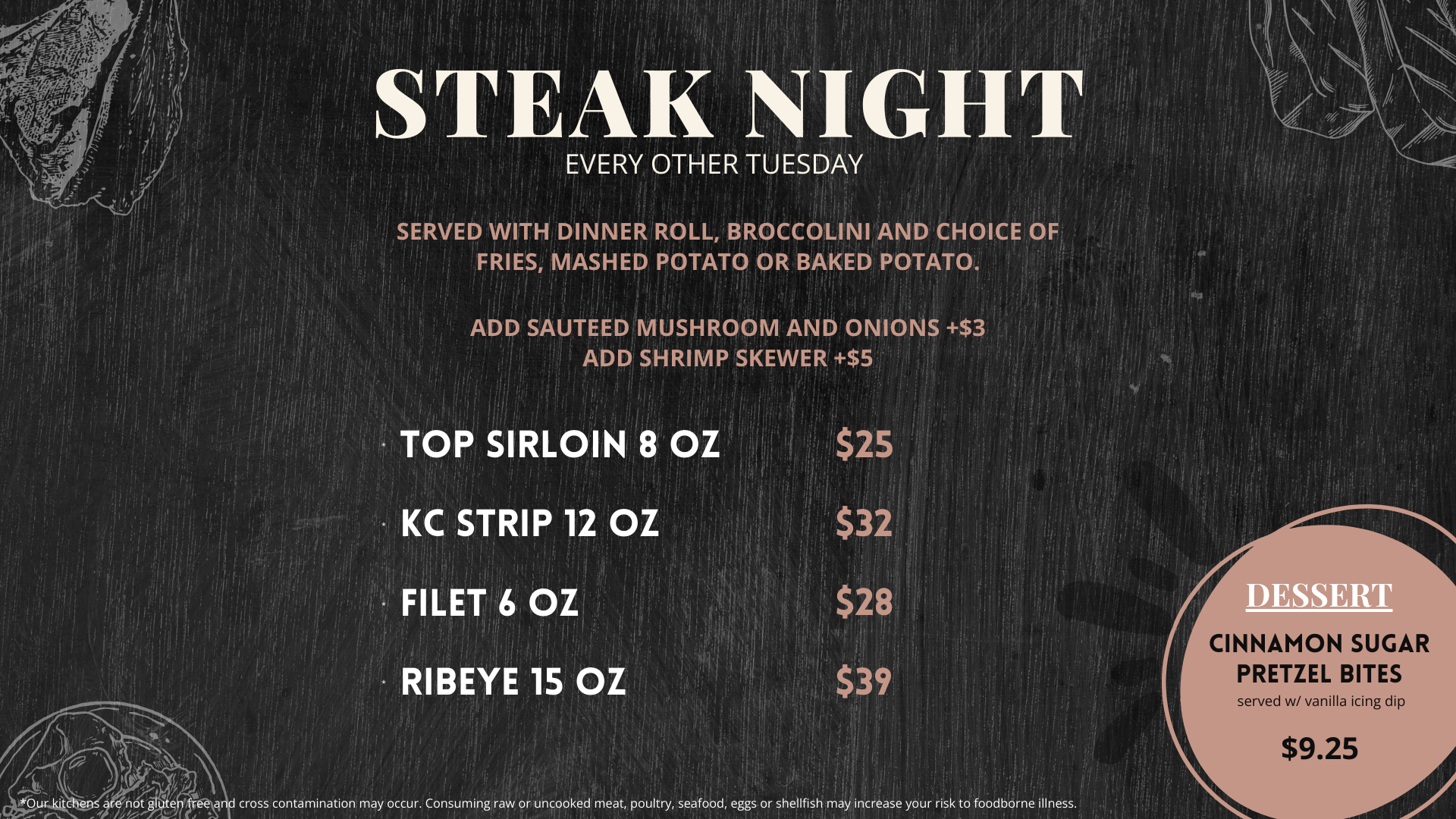 *Mill Pizza serves its full regular menu during Steak Night